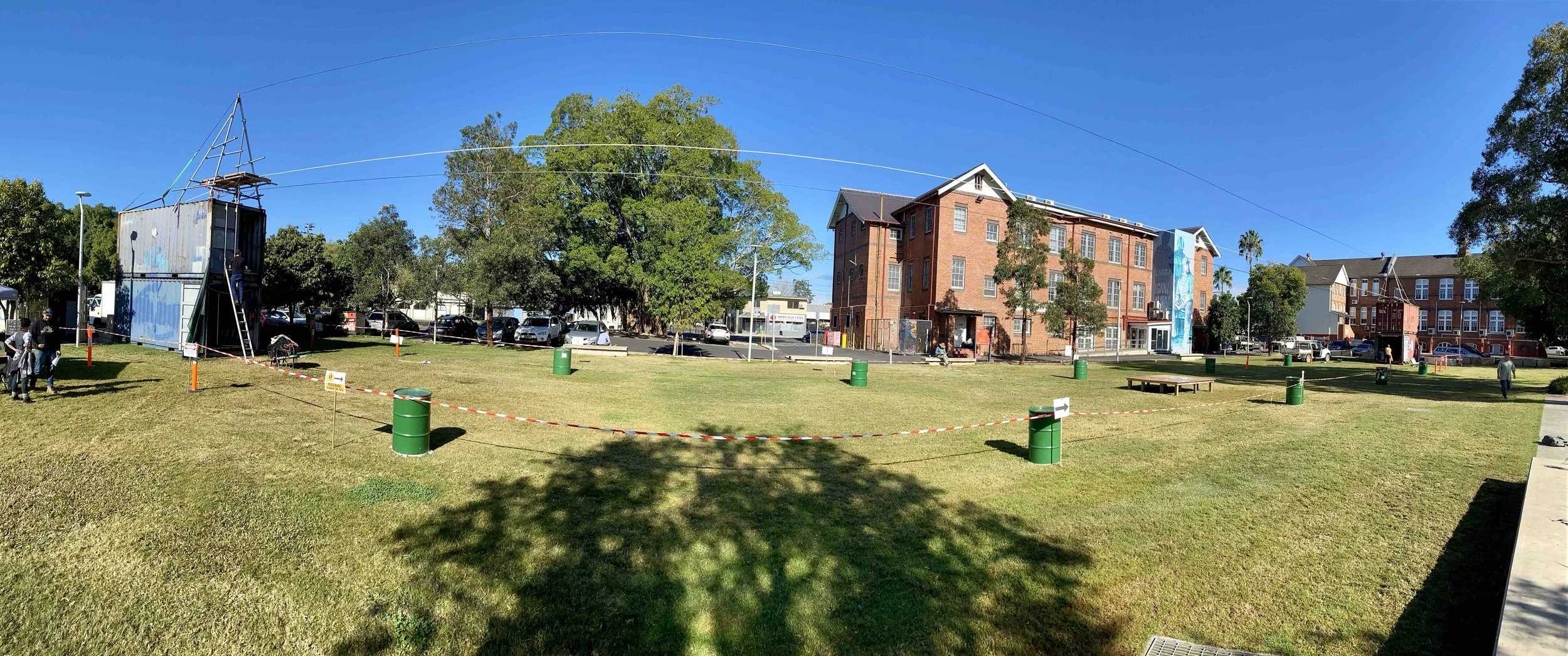 A pano shot of a wide open grassy space, Lismore’s Quad, filled with circus highwire equipment, incl stacked shipping containers & green barrels with hazard tape marking out a rectangle. The sky is blue, as old brick buildings and trees frame the shot.